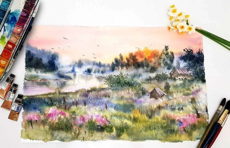 آموزش نقاشی آبرنگ منظره روستایی تکنیک رایگان