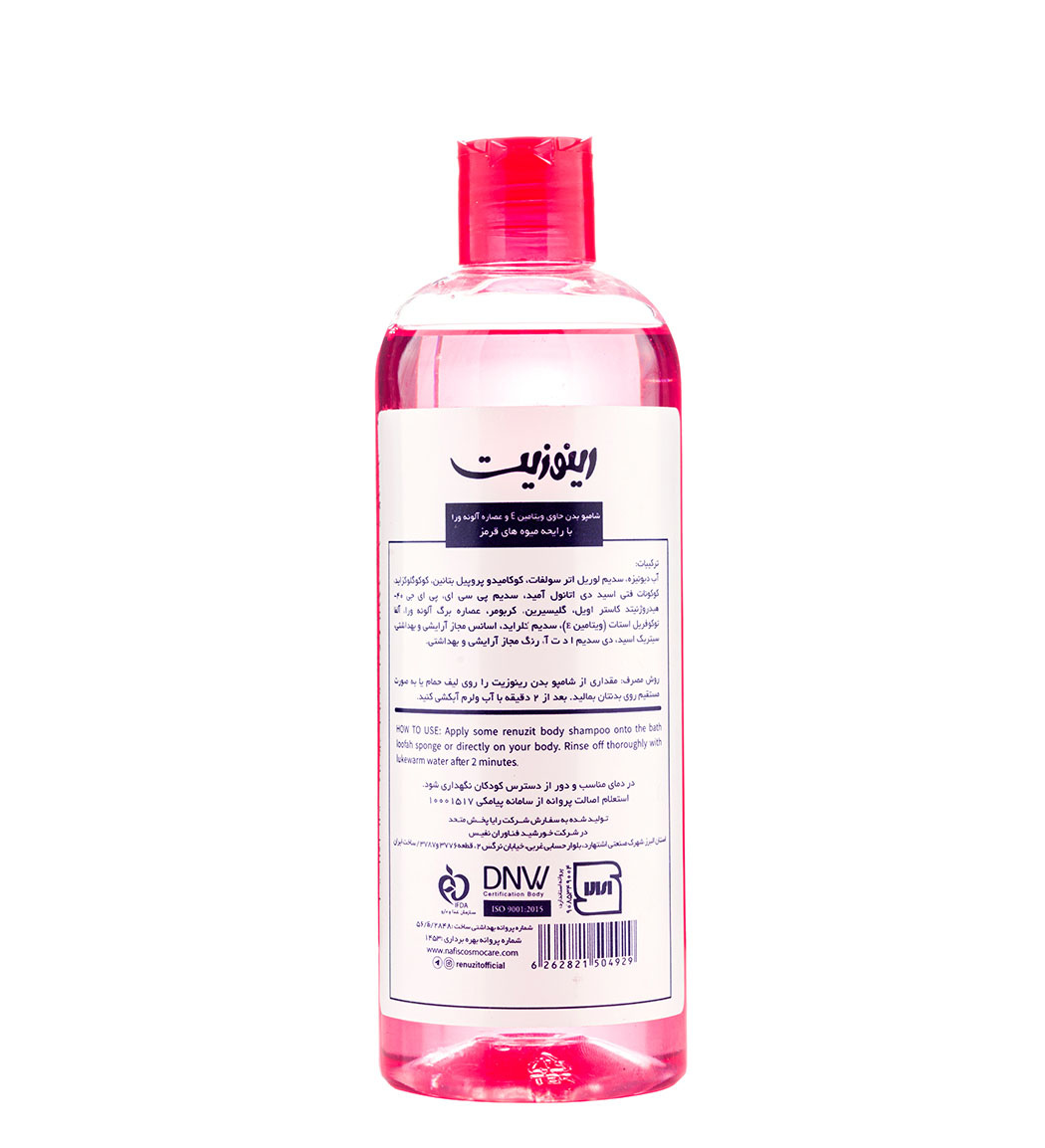 شامپو بدن رینوزیت فاقد مواد شیمیایی مضر مانند سولفات، پارابن و رنگ‌های مصنوعی است.