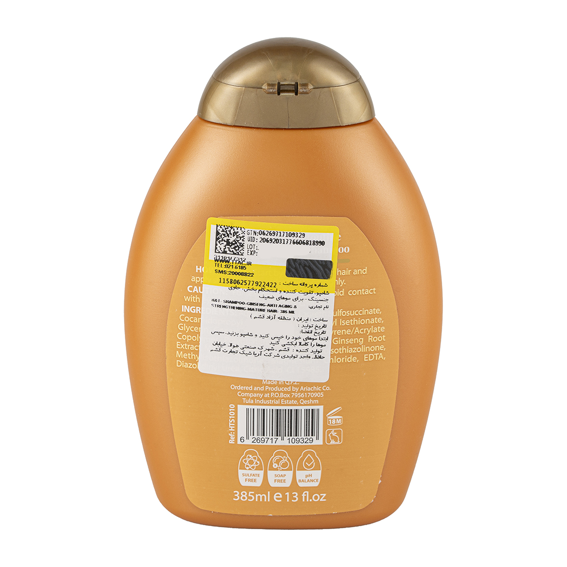 حجم این شامپو ۳۸۵ میلی‌لیتر است.