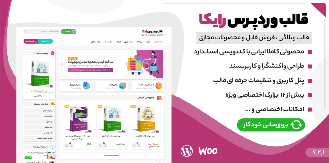 آیا به دنبال یک قالب وردپرس فروشگاهی هستید که هم زیبا و کاربرپسند باشد، هم امکانات حرفهای برای فروش انواع محصولات را در اختیار شما قرار دهد؟ آیا میخواهید فروشگاه اینترنتی خود را با کمترین هزینه و بالاترین کیفیت راهاندازی کنید؟ قالب رایکا، با طراحی ایرانی و امکانات فوقالعاده، دقیقا همان چیزی است که به آن نیاز دارید!