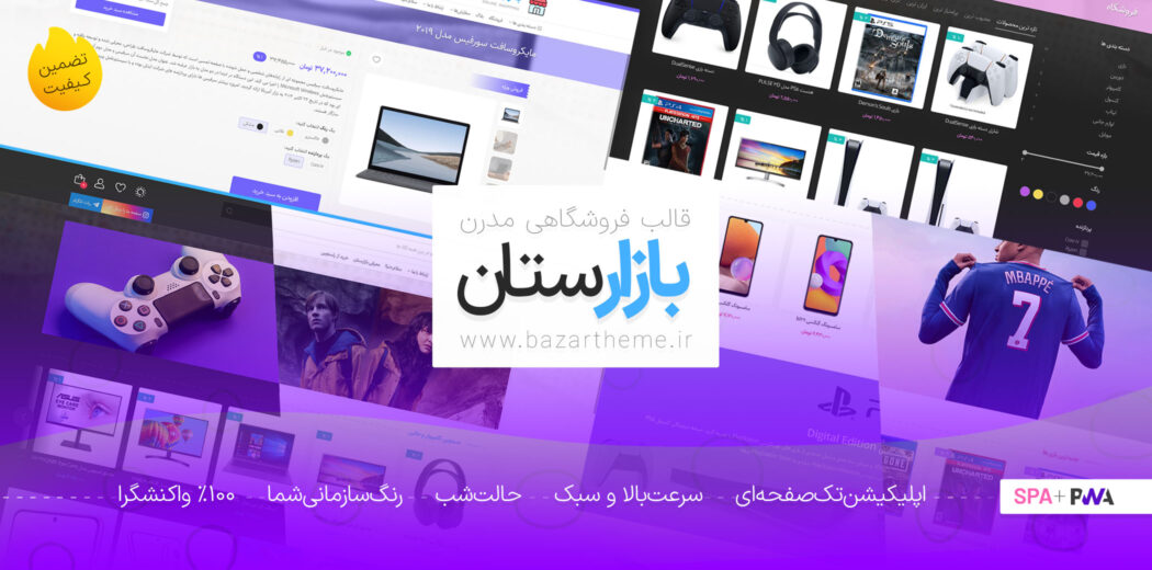 تکنولوژیهای SPA و PWA: با بهرهگیری از تکنولوژیهای SPA (Single Page Application) و PWA (Progressive Web App)، قالب بازارستان تجربه ای شبیه به اپلیکیشن موبایل را برای کاربران به ارمغان میآورد. دیگر نیازی به بارگذاری مجدد صفحات نیست و سایت شما به راحتی بر روی دستگاههای مختلف قابل نصب است.