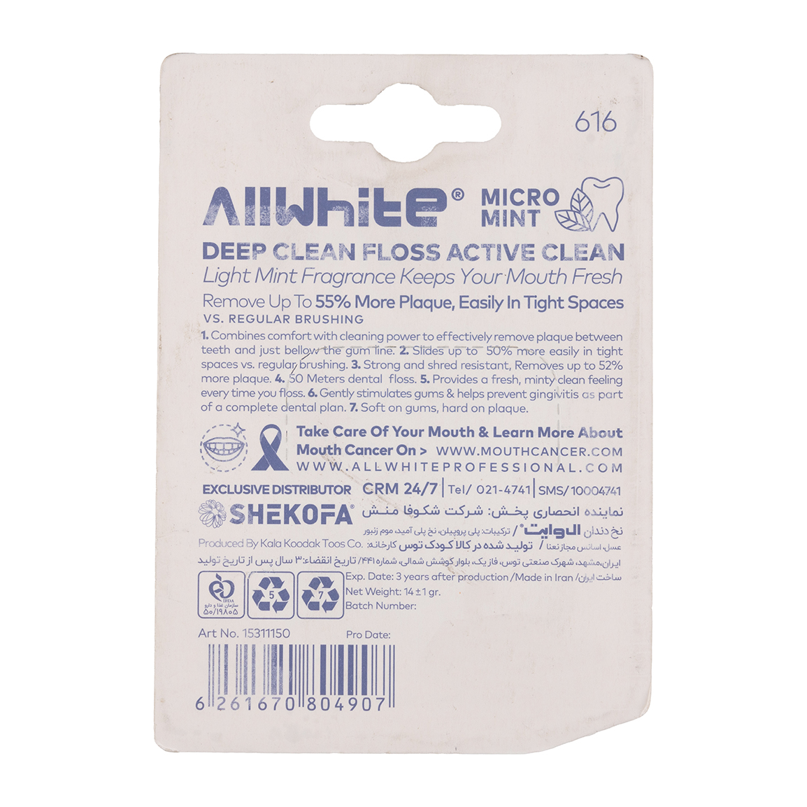 50 متر نخ، یه دنیا تمیزی: با هر بسته نخ دندان آل وایت نعنا، یه عالمه نخ دندون با کیفیت داری که میتونی برای مدت طولانی ازش استفاده کنی و خیالت از بابت تمیزی دندونات راحت باشه. 💯