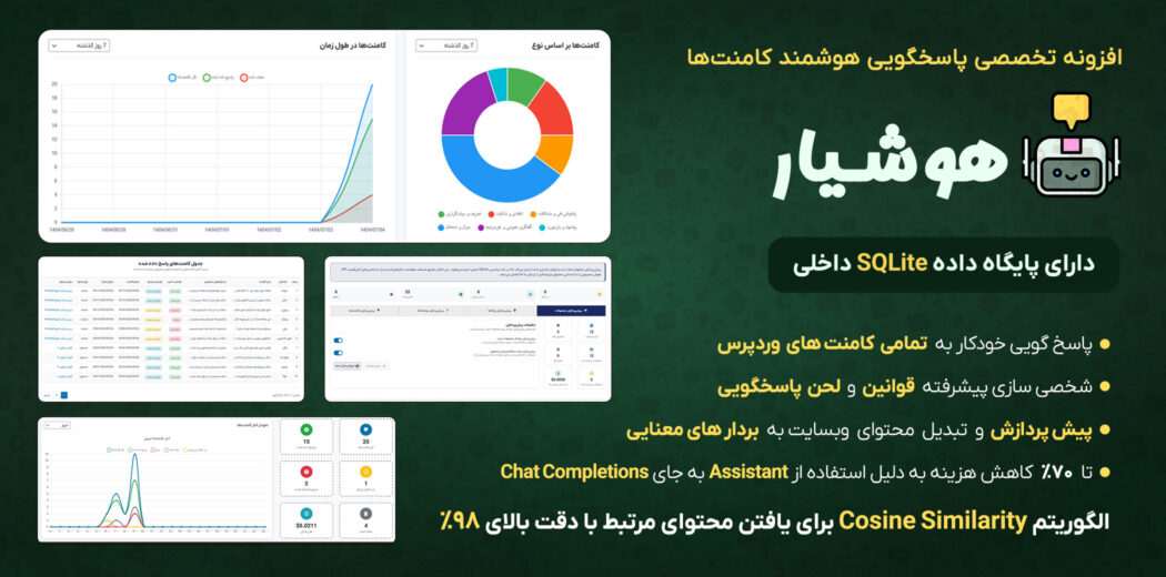 هوشیار فقط یک سیستم پاسخگویی نیست، بلکه یک ابزار تحلیلی قدرتمند نیز محسوب میشود. این افزونه کامنتها را به طور خودکار دستهبندی کرده و گزارشهای تحلیلی دقیقی از عملکرد سیستم و رضایت کاربران ارائه میدهد. نمودارهای پیشرفته، به شما کمک میکنند تا روند تعاملات را بهتر درک کرده و استراتژیهای خود را بهبود بخشید.