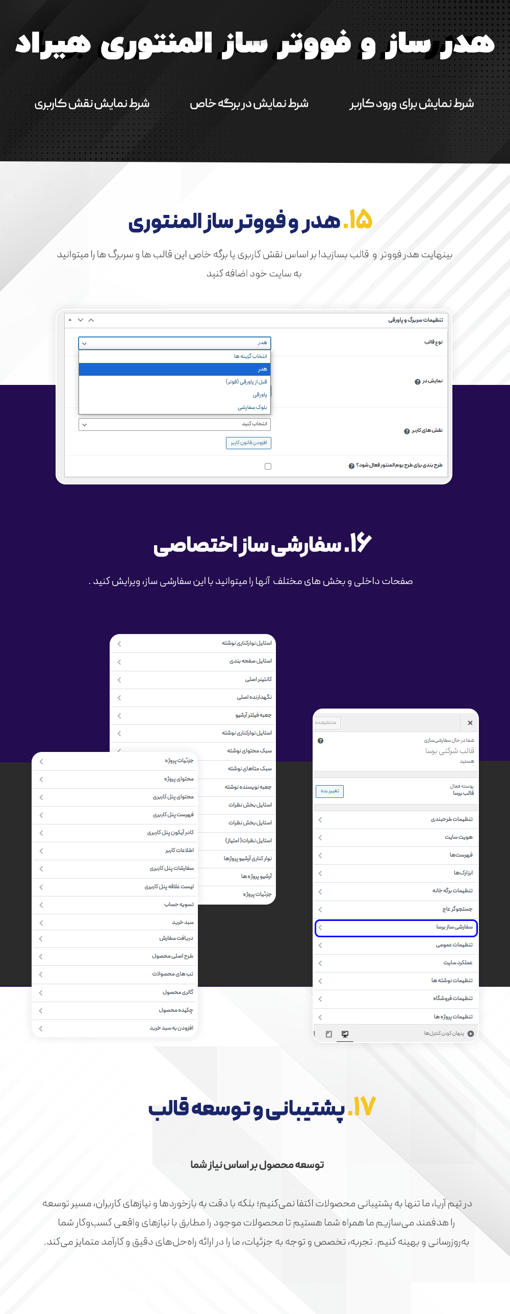 هیراد دارای یک هدر و فوتر ساز سازگار با المنتور است که به شما امکان میدهد بینهایت هدر و فوتر با طرحهای دلخواه خود بسازید و آنها را برای صفحات مختلف سایت اعمال کنید.