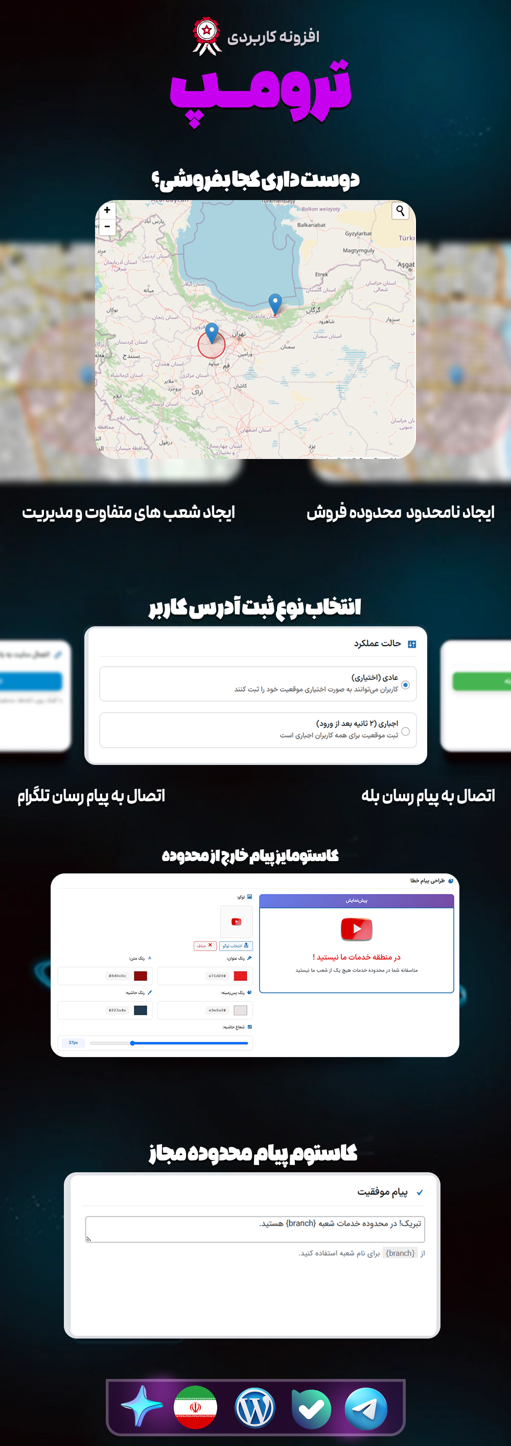 افزونه ترومپ فراتر از صرفاً محدود کردن فروش، به دنبال ارتقاء تجربه کلی کاربری شماست. شما میتوانید پیامهای سفارشی برای مناطق مختلف تعریف کنید. این پیامها میتوانند به مشتریان اطلاع دهند که آیا در محدوده خدمات شما هستند یا خیر، یا حتی پیشنهاداتی برای مناطق خارج از محدوده ارائه دهند. 💖