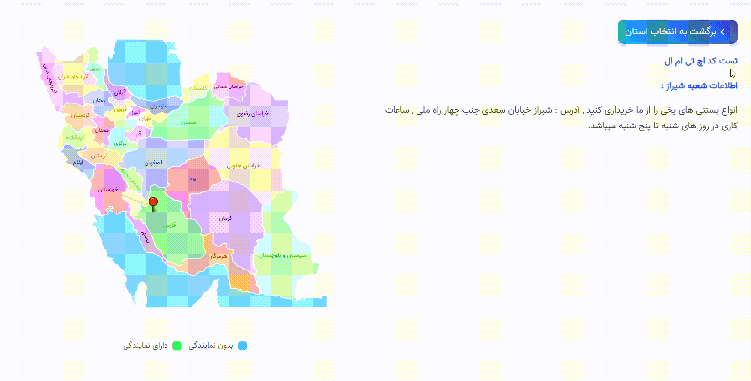 این نقشه نیز دارای دو بخش ریسپانسیو در کنار هم است. در سمت راست، لیستی اسکرولپذیر برای انتخاب استانها و مشاهده اطلاعات شعب ارائه شده است. در سمت چپ، نقشه ایران و سپس نقشه استان انتخابی نمایش داده میشود. این ترکیب، هم دسترسی به لیست اطلاعات را آسان میکند و هم نمایش بصری نقشه را فراهم میآورد. 💡