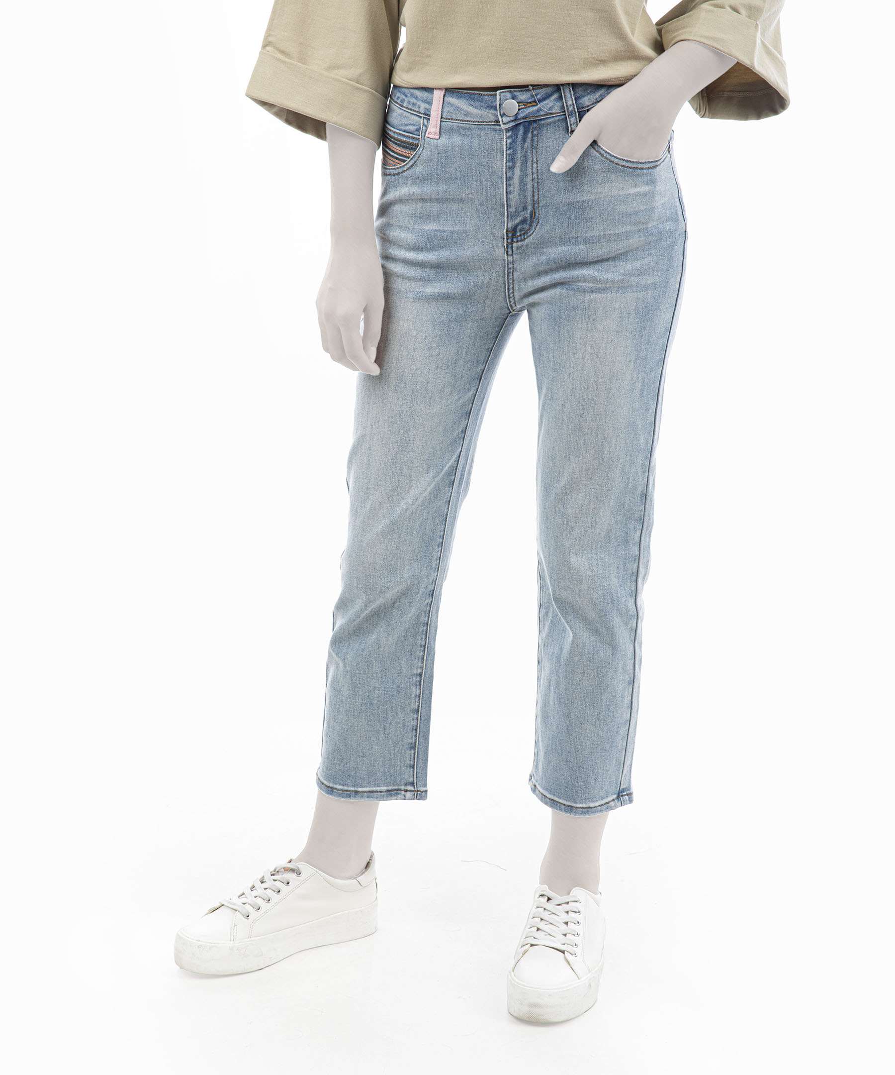 جیبها: دو جیب منحنی در جلو و دو جیب پاکتی در پشت