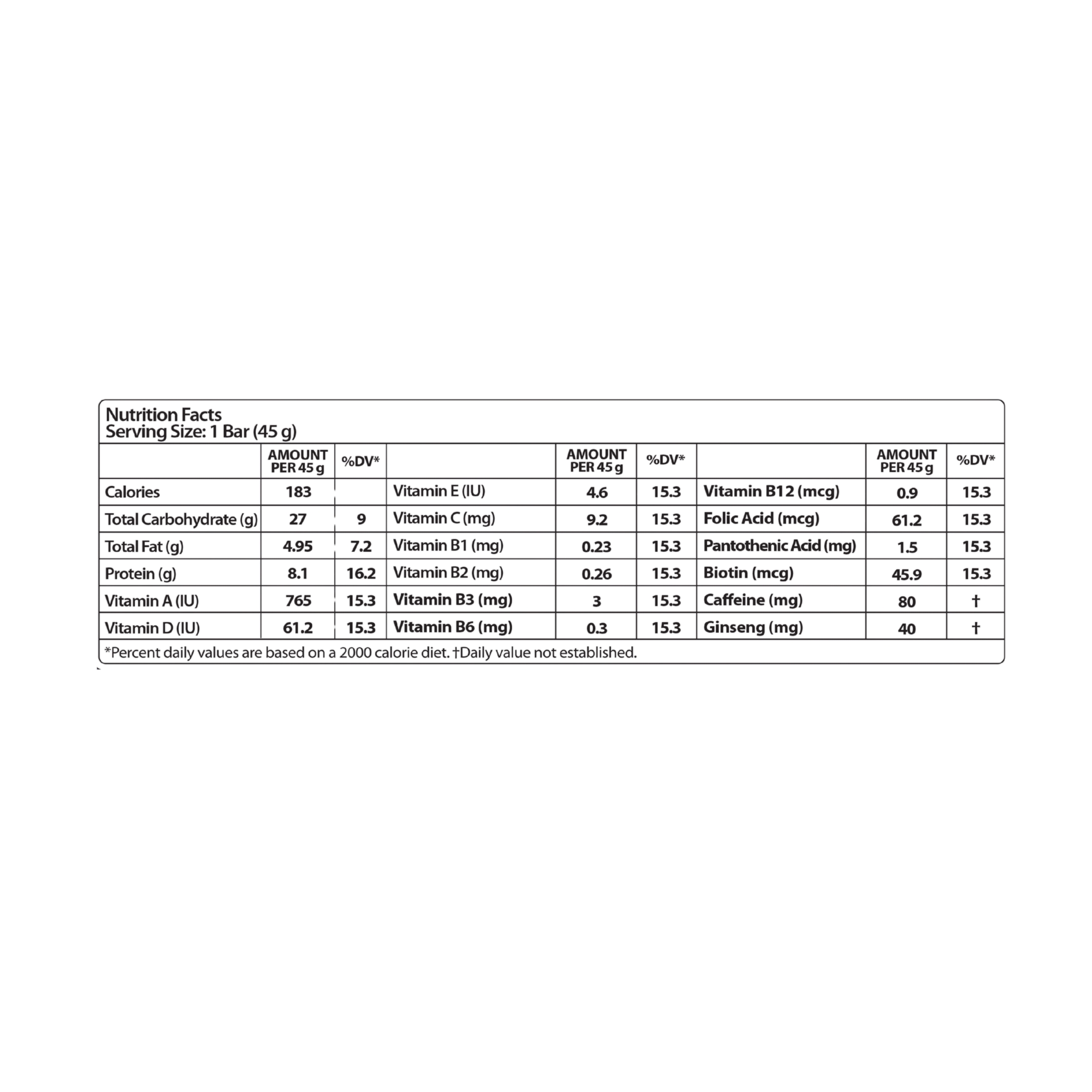 مقدار دقیق کافئین به طور جداگانه در بستهبندی ذکر نشده است، اما کافئین یکی از مواد کلیدی برای تامین انرژی در این محصول است.